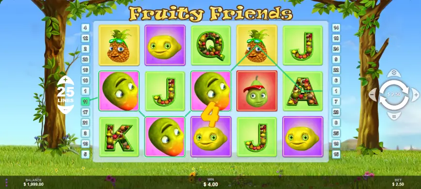 Las opciones de apuesta en Fruity Friends son bastante accesibles, con un rango que va desde $0.05 hasta $5 por giro. Esto permite a los jugadores con diferentes presupuestos disfrutar del juego sin sentirse limitados. Con un RTP del 94,5% y una baja varianza, la tragamonedas ofrece ganancias más frecuentes pero pequeñas, lo que resulta ideal para quienes prefieren un juego constante en lugar de una montaña rusa de subidas y bajadas.